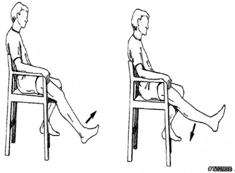 這個動作包括:坐在床上,單腳伸直,膝蓋下壓,感覺大腿肌肉繃緊;右腳膝蓋伸直、微彎,腳板向外翻,向左腳靠攏,抬腿約十秒鐘,左右腳交換動作,每天各做廿次。