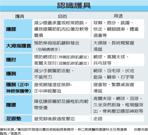 書田診所物理治療技術組組長蔡佩玲指出,常見的護具分三類,第一,保護關節與韌帶,如護膝、護腕、臏骨帶等;第二,直接在肌肉上加壓以保護肌腱,如護肘、大小腿的護套等;第三,運動員常用的白貼或肌內效貼紮,能提供關節及肌肉支撐作用。