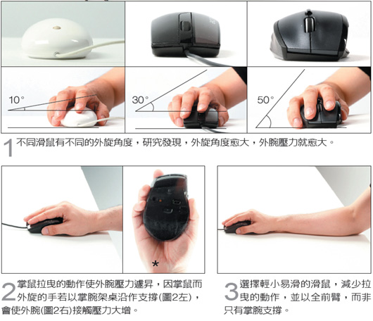 之所以造成上述腕傷,滑鼠設計與掌鼠動作都有關係。使用滑鼠時,力學上,手會自然外旋(pronation),不同滑鼠有不同的外旋角度(圖1)。研究發現,外旋角度愈大,外腕(pisiform area,圖2右*號處)部位的壓力就愈大。