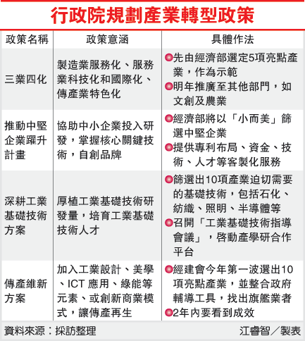 行政院今(15)日召開政務會談,研商經濟部「三業四化」政策。經濟部次長梁國新說,這5大產業,智慧生活、製作中心(工具機)屬製造業服務化;低溫物流則是服務業科技化、資訊服務是服務業國際化、創新時尚紡織則屬傳產特色化。