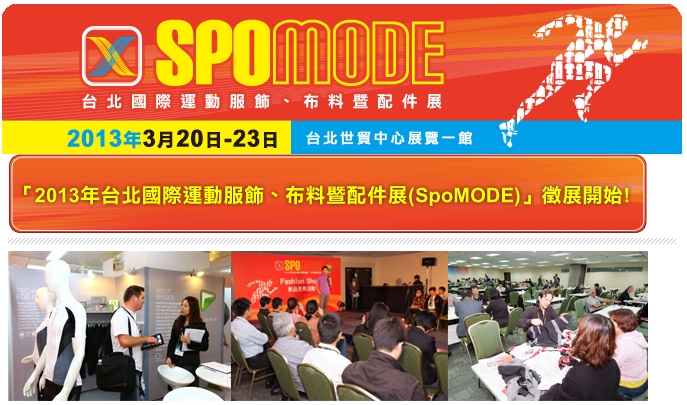 2013年台北國際運動服飾、布料暨配件展(SpoMODE),即日起開始受理報名,敬請把握機會!