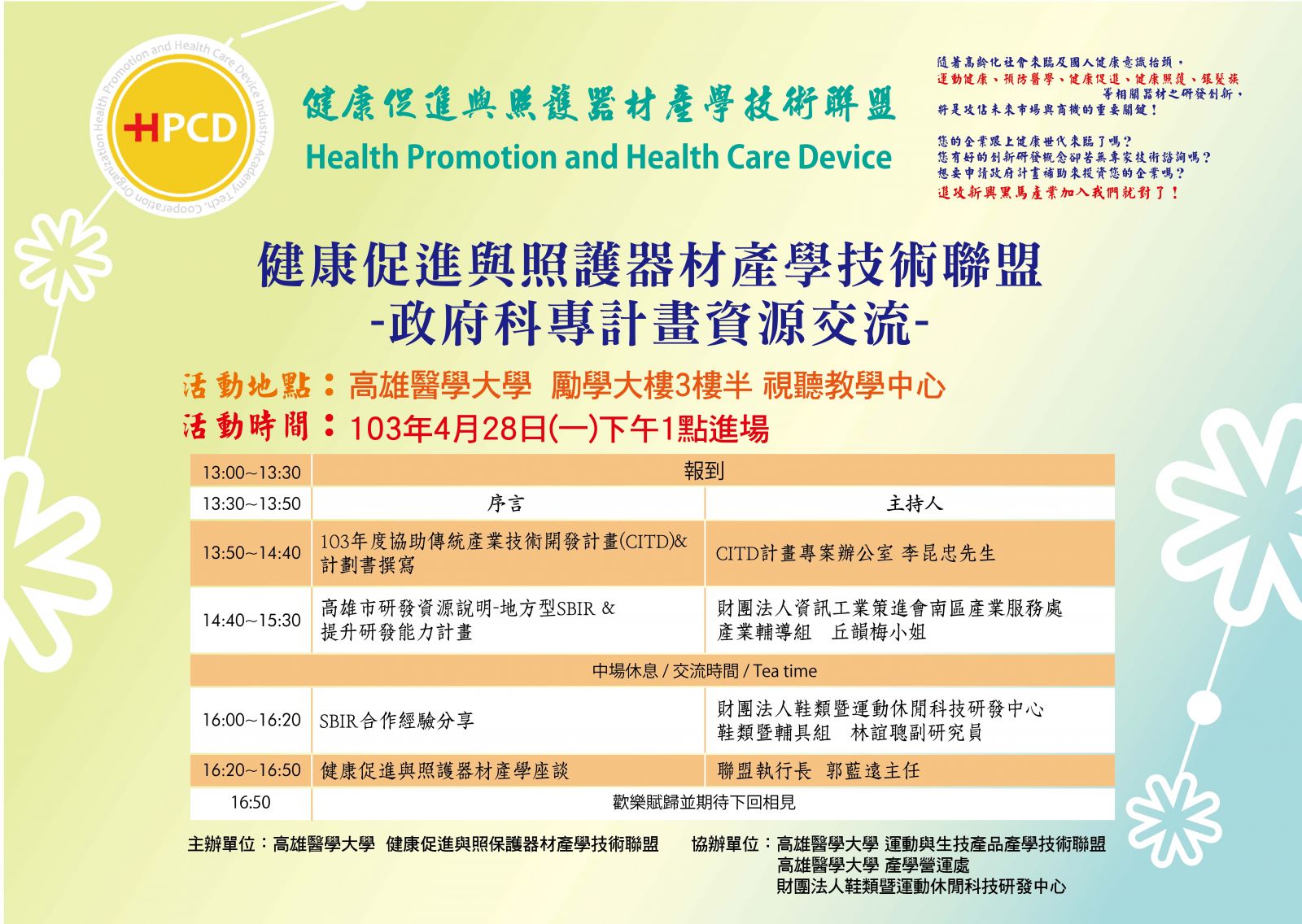 聯盟於4/28(一)下午13:00於高醫大舉辦健康促進與照護器材產學交流研討會-政府科專計畫資源交流