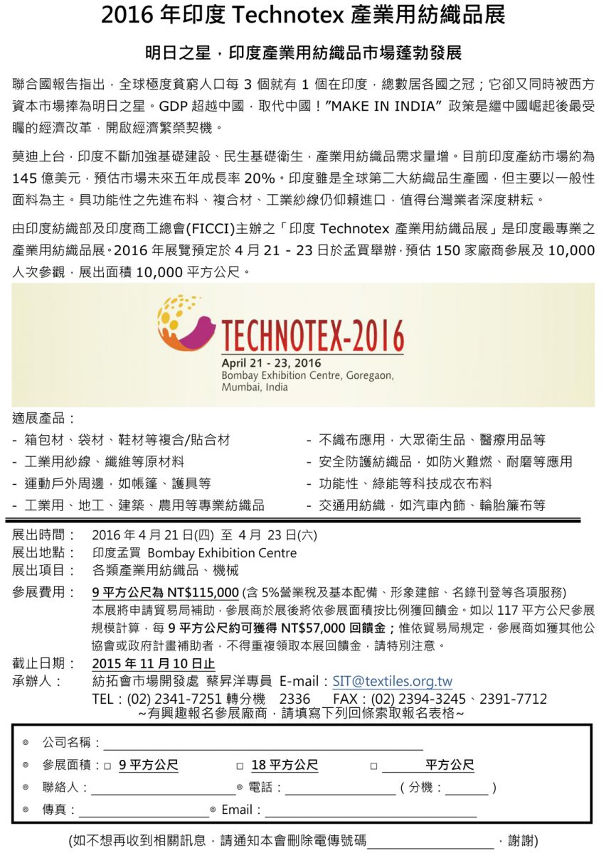 【公告】敬邀參加【2016 年印度 Technotex 產業用紡織品展】