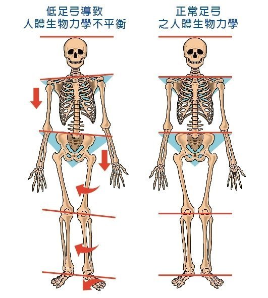 足弓過低時,會導致足體往內旋,連帶使得脛骨、膝蓋、股骨和髖關節往內轉,並使同側骨盆歪斜向下,此時,脊椎為了維持站立會往對側傾斜,這樣一來反而使另一邊肩膀下垂。