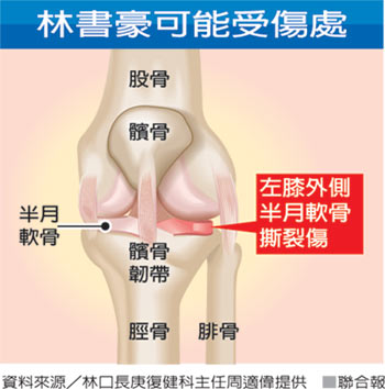多次擔任中華奧運、亞運代表團隨團醫師的林口長庚復健科主任周適偉說,林書豪傷勢嚴重與否,要看撕裂傷位置及傷勢大小;若撕裂傷大,又位於關節中央,需切除全部半月軟骨,「整個拿掉就不用玩了。」
