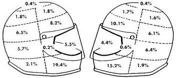 車禍主要撞擊在下巴區域佔35%,這顯示出假設騎車時只戴一頂四分之三罩式安全帽,保護範圍只能有65% 的防護性;若戴著一頂面罩更短如瓜皮帽,就只能受到39% 的保護,建議請配戴全罩式的安全帽較為安全。