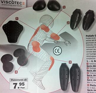 重機保護片設計一般的防摔衣在衣服內裡,都作可拆隱藏式保護墊,保護的部位也有所不同,分別為肩、肘、腰、臀、膝等,最基本的需求為五件式護具,依各廠牌的開發設計而定,當然保護片分佈越多,身體受到的保護相對提高。