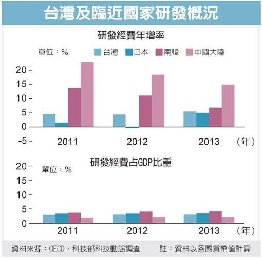 儘管台灣研發投入占GDP比重已接近3%,但主要競爭對手南韓,其研發經費占GDP比重早已超過4%,2013年更超過台灣1.16個百分點。