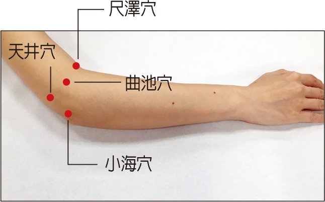 平日可按壓穴道保健膝關節。膝蓋痠痛時,按壓位於上、下手臂交界處的尺澤、曲池穴,與手肘外側關節處的小海、天井穴,有助舒緩膝蓋不適症狀。