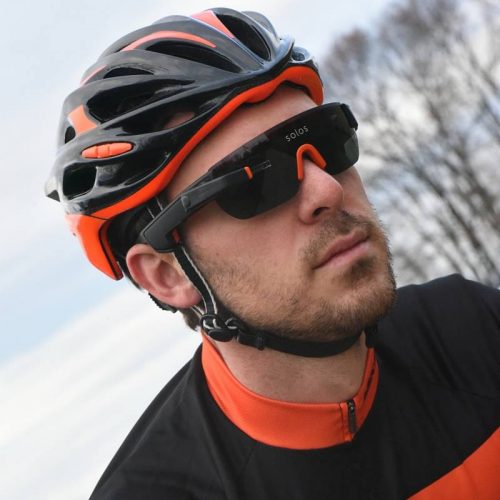 Solos 看起來和Google Glass 有些類似,它極為輕巧而富流線型的外型,內含擴增實境功能的抬頭顯示器(HUD),使用時,在螢幕右上角會顯示符合人體視線範圍,且適當大小的清晰畫面,意即你可以同時看螢幕資訊,而周遭環境的視線也不受干擾。