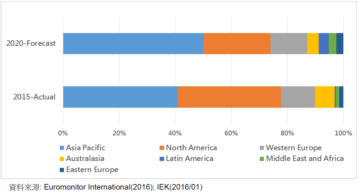 在新一波運動健康浪潮中,智慧穿戴裝置扮演舉足輕重的地位。而過去以美國為全球運動領導市場之首的局面,未來也將可能逐步翻轉。在亞洲近起年東協新興市場所得快速躍升、生活水平、健康運動觀念提高下未來亞太將成為全球趨動力所在,據Euromonitor(2016)全球穿戴式裝置銷售數量顯示,2015 年亞太市場已佔全球41.02%,當年度是亞洲市場銷售數量佔比首度超越北美市場(36.68%)的一年,其中中國大陸、日本與南韓等亞洲領導市場銷售更呈現倍數成長,泰國、新馬等地也在後期產品導入後銷售量快速崛起,值得期待。