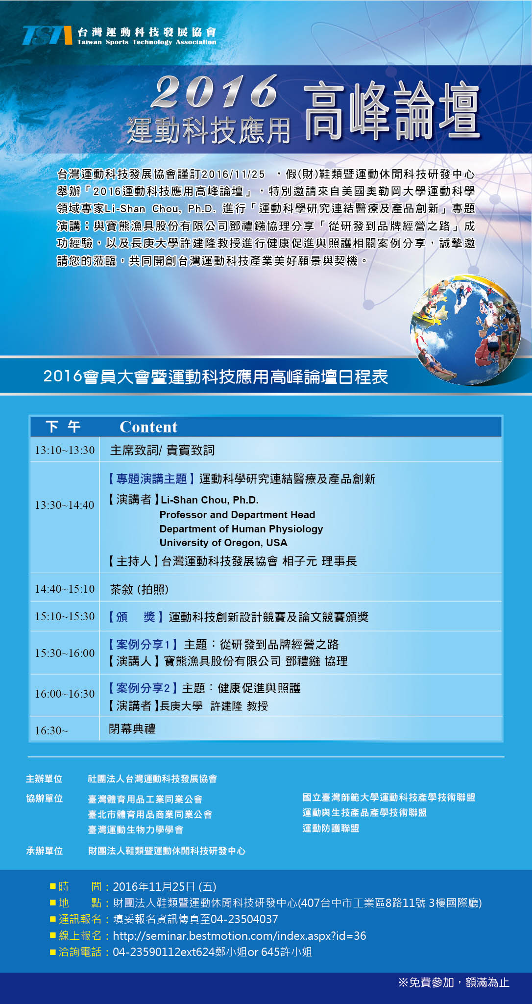台灣運動科技發展協會謹訂2016/11/25,假(財)鞋類暨運動休閒科技研發中心舉辦「2016運動科技應用高峰論壇」,特別邀請來自美國奧勒岡大學運動科學領域專家Li-Shan Chou, Ph.D. 進行「運動科學研究連結醫療及產品創新」專題演講;與寶熊漁具股份有限公司鄧禮鏹協理分享「從研發到品牌經營之路」成功經驗,以及長庚大學許建隆教授進行健康促進與照護相關案例分享,誠摯邀請您的蒞臨,共同開創台灣運動科技產業美好願景與契機。